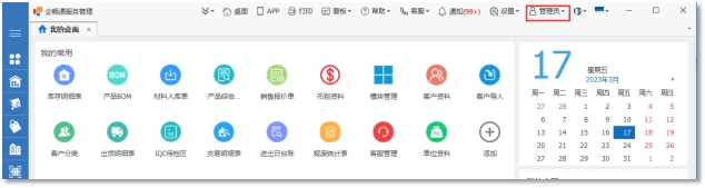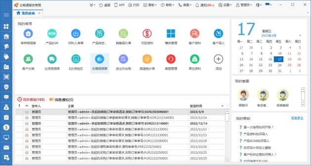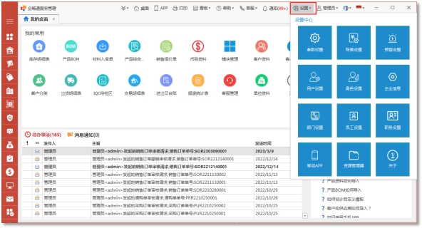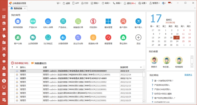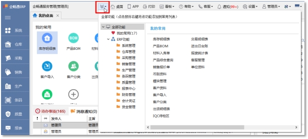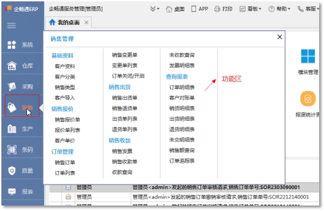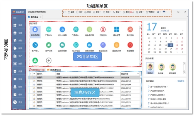 登录后进入主功能主页,所有功能都在主页操作完成,主页由目录导航区、功能菜单区、常用菜单区、消息待办区组成。每个区域都有不同的入口