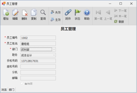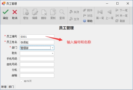 新增员工时,点击增加按钮进入新增模式,输入员工编号,员工姓名等基本信息即可完成新增。