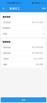 APP中可以管理员工信息,进入员工管理,点击新增员工填写基本资料后即可完成新增。