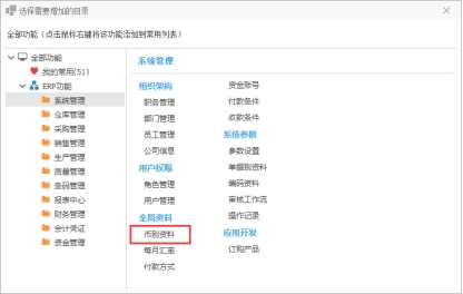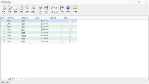 管理币别资料,以区分本币和外币以及币别汇率,单价和金额小数位数等资料。如果修改了币别的小数位需要重新登录使系统生效