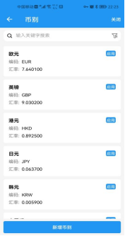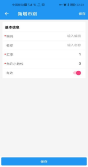 APP中可以管理币别信息,进入币别管理,点击新增币别填写基本资料后即可完成新增。 同时也可对币别资料进行删除,编辑,失效等操作。