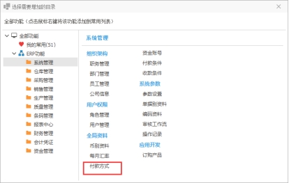 管理采购系统的付款方式或销售系统的收款方式。例如支付供应商货款是采用银行汇款还是支票,移动支付等方式。
