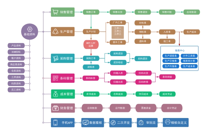 在企业管理中,企畅通ERP覆盖了所有的业务流程和业务部门,企畅通提供各个系统版本来满足企业流程适配,同时可以自由调整定制各业务流程。在企业管理可自由调整流程细节,可严可松,可简化或追加。以下为全流程图