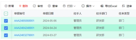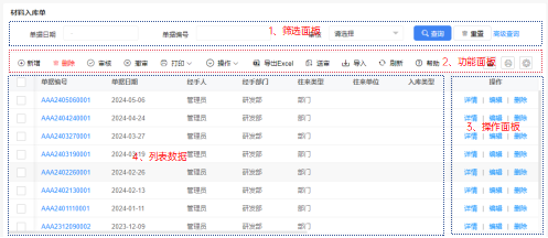 在清单列表视图中可以清查看单据或资料列表明细,并可以批量操作程序的基本功能。在使用清单列表的功能时都需要先选中资料项目,选中的方法是将最左侧的选中框打钩。以下介绍清单列表视图的各个区域说明和基本操作说明