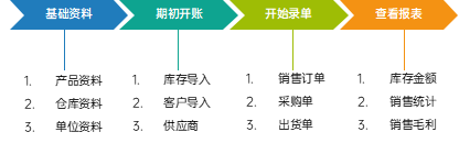 恭喜您已经初步了解了系统基本的操作方法,下一步正式使用系统,通常在正式使用前需要按照以下步骤图进行账套初始化。您也可以跳过本步骤,在正式使用过程中来完善资料,本步骤将为您介绍初次使用系统的方法: