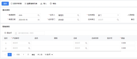 1)使用手工录入入库单(如下图),需要输入红框内的数据(产品编号,仓库,数量)