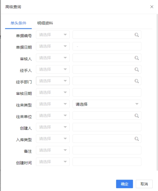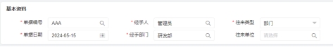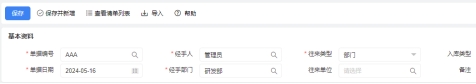 新开单时需要输入单据的基本信息(系统称之为单头),栏位带有红色星号的属于必输栏位(必须输入不可留空)。一般单头输入时需要选择数据,如果栏位拥有开窗放大镜(