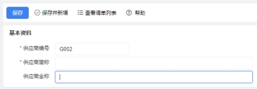 2)供应商资料录入,在供应商资料程序新增,缺省情况下只需输入供应商名称即可完成供应商录入,如果有其他供应商信息,例如付款条件,币别,税率等信息,也可在此维护好,录入完点击保存完成新增。