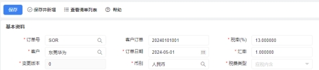 进入【销售管理】-【销售订单】菜单打开新增页面准备录入新订单,根据客户下单的信息,例如订单号,产品,数量,单价,交货期等信息在录单页面依次录入,其中页面中字段前代红色星号标记的为必须输入栏位(例如客户为必须输入)。输入完成后点击顶部的“保存”按钮提交保存。
