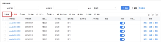 3)材料入库单录入完毕后需要点击“审核”,审核后库存自动增加。至此库存导入步骤完成。