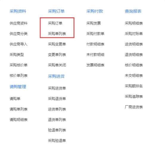 2)通过导航菜单直接进入新增页面,例如点击以下页面中的“采购订单”可直接进入新增页面。一般菜单末尾带有“列表”字符的属于清单列表,反之不带“列表”字符的是直接新增的详情菜单。