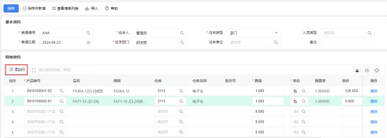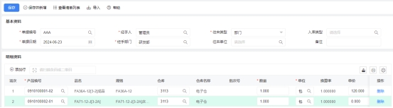 )则代表是必须输入栏位。输入一行后可以点击头部的“添加行”增加一行。如果需要删除行,则可点击行右侧的“删除”。例如以下是录入完成的单身显示。