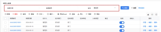 每个菜单都分为清单视图和详情视图,通常清单列表菜单位于详情菜单的下面。清单视图下主要用于查询单据或资料的单头清单列表,主要信息包含单单据状态,审核信息等。详情视图下显示单据的详情资料,包含单头资料和单身资料。