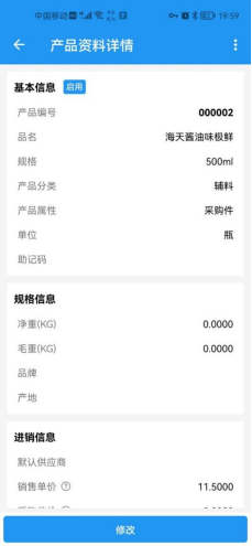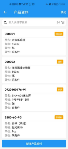 使用App可以快速管理产品资料,包括新增,修改,删除等。并能通过产品资料进行串查产品相关的报表。能使用扫码识别快速增加产品资料