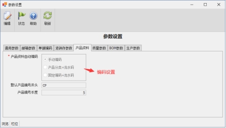 通过参数设置来调整默认的编码规则,在参数设置中可以指定编码方式和编码长度。其中选择“产品资料自动编码”方式为:固定编码+流水码时,默认产品编码开头字符才会生效。流水码长度最低三位,