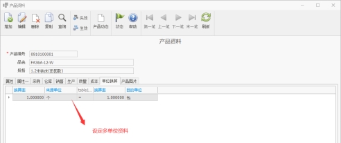 产品的多单位,一个产品可以使用多个单位,需设定多单位的转换率资料,在产品资料的单位换算页签设定多单位转换率,则可在其他系统使用多单位