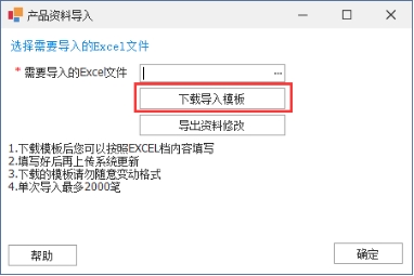 2)下载新增导入模板:在“产品资料导入”功能界面,点击“下载导入模板”按钮(如下图)
