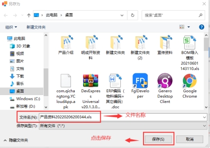 3)在弹出的保存对话框选择保存路劲(如下图),点击保存后将自动打开EXCEL文件。默认的产品资料导出文件是以“产品资料”开头。