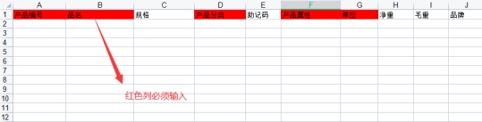 4)编辑EXCEL模板:根据上一步骤打开的EXCEL模板文件(如下图)进行资料填写。EXCEL中的红色列必须输入,例如产品编号,品名,产品分类等