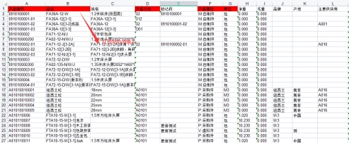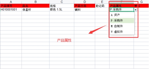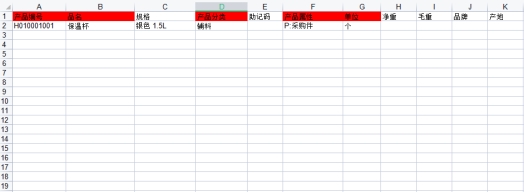 2)编辑EXCEL模板:在打开的EXCEL模板中,编辑需要修改的栏位,红色列是必须输入的,例如:产品编号,品名,单位,属性。其它白色栏位可以按照选择填写