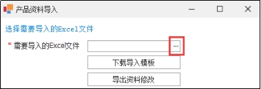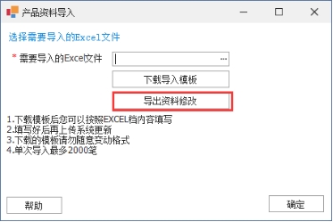 1)导出资料修改模板:在“产品资料导入”功能界面,点击“导出资料修改”按钮(如下图),点击后选择保存位置后将自动打开模板文件。