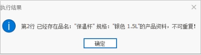 7.2)弹出以下错误提醒(如下图)代表品名加规格已经存在产品资料中,相同的品名和规格不可重复。