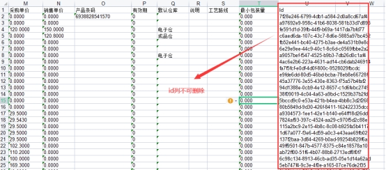 3)编辑模板注意事项:导出资料修改的模板中,请勿删除id列,否则会导致更新不成功