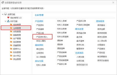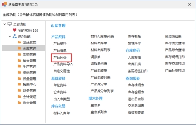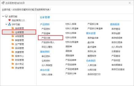 1)在新增产品前需要先增加“产品分类”,产品分类功能的进入方式:【仓库管理】-【产品分类】-【产品分类】