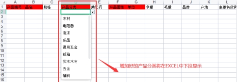 产品分类支持多层级支持,可以先增加上级分类再增加下级分类。增加好的产品分类将在EXCEL模板中以下拉列表框显示(如下图)