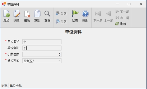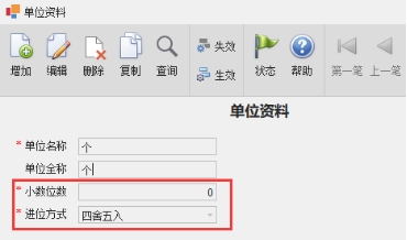 例如:单位 “个” 一般小数位设定成0 ,则不允许0.1个,最小数量为1。按照设置的进位方式进行进位