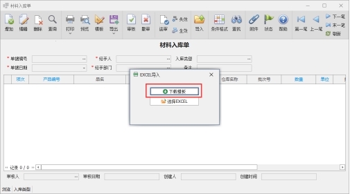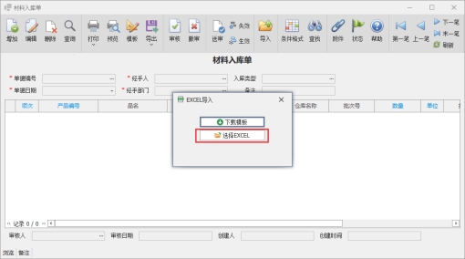 材料入库单可以使用EXCEL进行批量导入,本步骤介绍EXCEL导入的方法