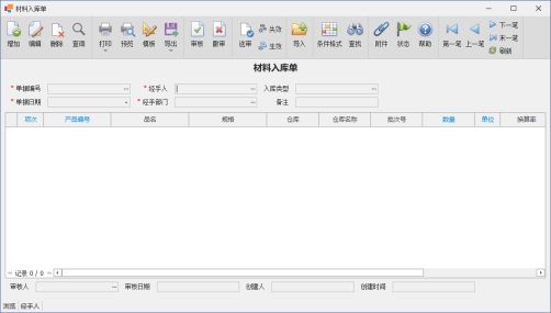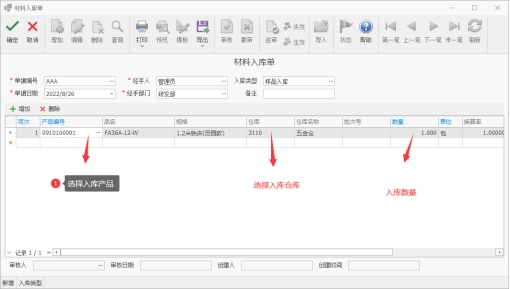1)新增材料入库单,点击增加按钮进入新增模式,新增模式下必须输入产品编号,仓库,入库数量。