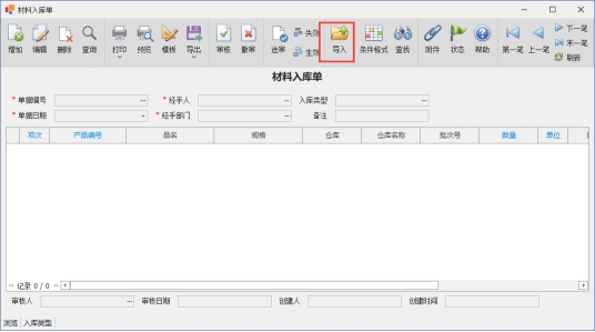 1)在材料入库单界面点击“导入”按钮(如下图)
