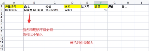 3)编辑EXCEL模板内容,模板中黄色列必须输入(如下图),模板编辑好后进行保存,然后关闭模板