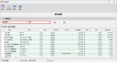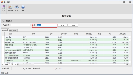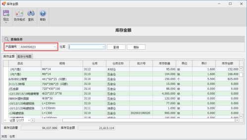 2)查询指定料号的库存金额,在产品编号处选择指定的产品编号,可以选择多笔
