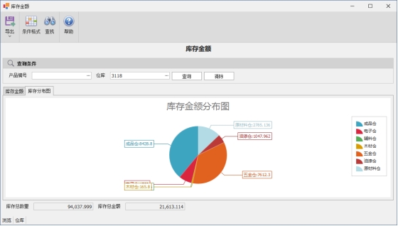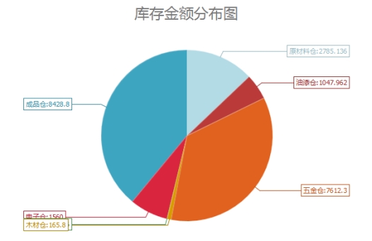 库存金额将按照仓库进行分组统计库存金额分布图图标,点击图例即可刷新统计图
