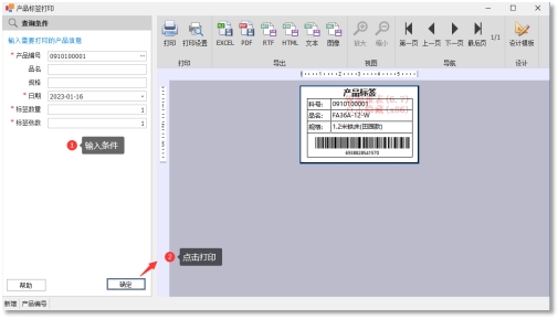 在快速查询区域内输入查询条件,点击打印启动打印预览,点击“设计模板”按钮可自由设计标签