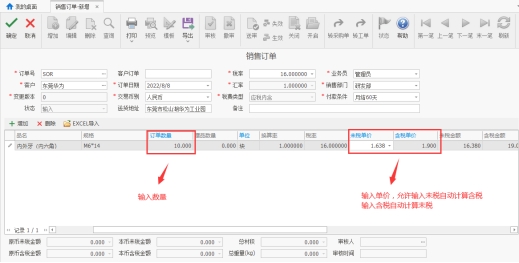 4.输入数量和单价,在输入未税单价后将自动计算含税单价,如果输入含税单价后将自动计算未税单价,如果已做报价单,将从最新的报价单抓取最新单价