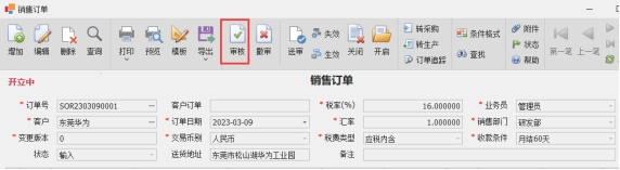6)订单确认无误后进行审核订单,点击审核按钮进行审核。注意:如果启用了审核工作流可以设置审批人进行送审管理