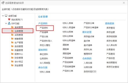 1)建立费用类料号(如果已经建立过,可略过此步骤,可以直接使用无需再次建立),进入仓库管理-产品资料 进行建料