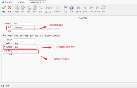2)建立费用料号(如下图),与普通建料方法一样,需要填写产品编号,品名和单位,注意必须将产品属性选择为费用