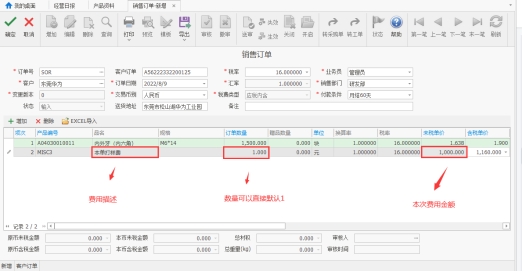 销售订单下单时,有时需要添加订单附加费用,例如打样费,快递费,模具费,维修附加费等费用,需要在与客户对账时在对账单体现。