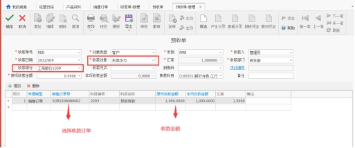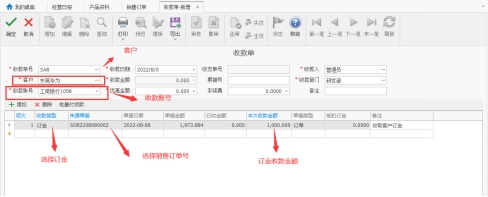 1)选择客户和收款账号,以及指定的销售订单,填写收款金额保存即可完成预收订金