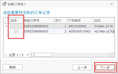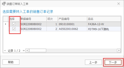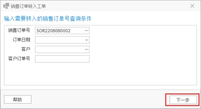2)弹出的画面中已预设了销售订单号无需更改,可以直接点击下一步
