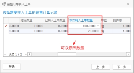 4)如果您需要调整转入工单的数量,您可以在上一步画面中拖动滚动条到如下图位置,修改转入数量