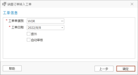 5)当需要自动审核工单时,勾选如下图,点击确定即可转出为生产工单。