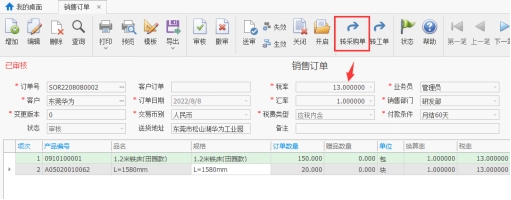 如果本次销售订单产品需要向供应商采购。在销售订单界面可以直接转入采购订单,以简化操作。需点击如下图的菜单来打开操作画面。