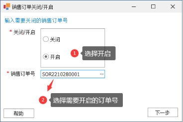 2)选择“开启”类型,然后输入销售订单号并点击下一步。如果输入的销售订单未被关闭则无法进入下一步,此步骤需要保证选择的销售订单时已被关闭状态