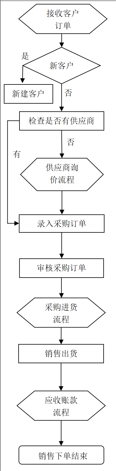 1.接收客户订单进行系统下单录入,产品需对外采购 2.确定下单客户是否为新客户,如果为新客户需先建立客户资料,指定客户的币别,税率,收款条件等,如是老客户则直接进入下一步 3.检查是否有对应供应商,如果有直接进入采购流程,如果没有则进入供应商询价流程新增供应商 4.询价流程包括:采购询价,新建供应商资料