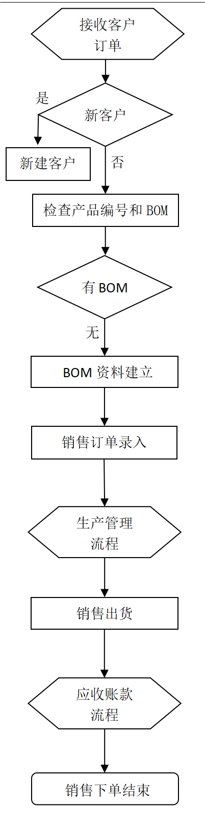 1.接收客户订单进行系统下单录入,产品需厂内自行生产 2.确定下单客户是否为新客户,如果为新客户需先建立客户资料,指定客户的币别,税率,收款条件等,如是老客户则直接进入下一步 3.下单前检查是否有对应型号的产品编号和BOM如果没有,通知工程部门建立产品资料 4.已存在产品资料和BOM则直接进入下一步 5.由工程或研发人员根据客户下单的产品信息建立产品BOM